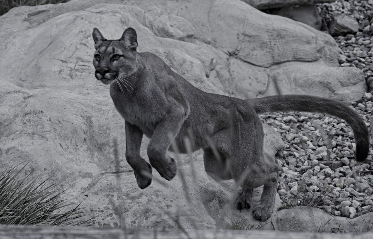 Cuando dio los primeros pasos, la rama seca del pino hizo ruido y alertó a su presa, entonces aceleró a toda velocidad, sus patas traseras, más largas que las delanteras le dieron un impulso enorme y con la vista hacia adelante, brincó hacia el cuello del humano, cuando cerró fuertemente las mandíbulas se encontró con que tenía en ellas la muñeca y mano del hombre, entonces en un intento de prenderle de la cabeza, lanzó un zarpazo hacia su cara para evitar que huya, pero su piel era muy delgada y sus garras cortaron con facilidad la piel del rostro, emanando de su mejilla y nariz el néctar carmesí de la vida, encendiendo su ferocidad y hambre desesperadas, el olor metálico de la sangre le recordó a la suya propia que esperaban por ella y por su alimento. Sus casi 60 kilogramos de peso hicieron caer su presa de culo y el desbalance del zarpazo fallido le hicieron perder el equilibrio, cayó rodando e intentó ponerse en pie para terminar el trabajo mientras el hombre estaba aún caído.